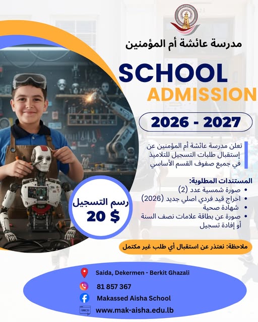 16 April تعلن مدرسة عائشة أم المؤمنين عن استقبال طلبات الطلاب الجدد في جميع صفوف المرحلة الأساسية Latest News Leave a comment